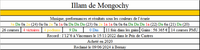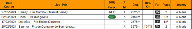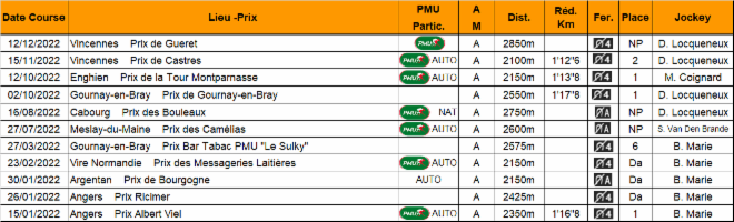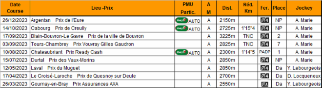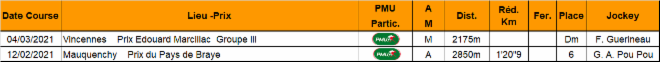 | Nom | Année | Sexe | Père | Attelé | Monté | Gains |