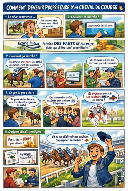 Afin de permettre à tous de pouvoir se lancer dans l'aventure, nous recherchons pour vous des chevaux dont les parts de 10% peuvent se négocier à partir de 800€.